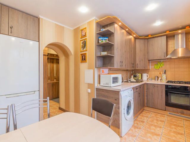 Спальня: двухспальная кровать 160х200 с новым жестким ортопедическим матрасом; шкаф-купе. Вторая комната: двухярусная кровать с ортопедическими матрасами 90х200, шкаф-купе, телевизор, рабочая зона (стол и кресла). Кухня-гостиная: обеденный стол, 2 комода, обеденный стол, дизайнерское зеркало в рост, холодильник, кухонные шкафы со всей необходимой посудой и приборами, микроволновая печь, варочная панель, электрический чайник, тостер, фильтр для воды, вытяжка. Прихожая: шкаф для одежды, обувница. Ванная комната: бесшумная стиральная машинка фен, большая ванна.