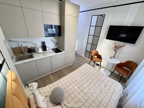 — стильная квартира-студия - кухня с комнатой объединены