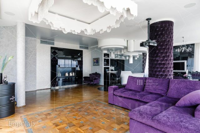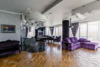 Квартира разделена на две части: в одной большой парадный холл с системой хранения, гостиная и кухня, оборудованная техникой Miele, в том числе встроенной кофемашиной и пароваркой. Вторая приватная часть с двумя спальнями, кабинетом и большим санузлом с гидромассажной ванной. В кабинете есть спальное место, библиотека, массажная кровать, вибро платформа, стол, велотренажёр, принтер, вместительный гардероб и выход на балкон. В одной спальне большая кровать king-size, из второй спальни можно выйти на балкон кабинета, а также на отдельную террасу.