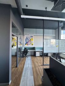 Офис - двухэтажный, расположен на последних двух этажах, имеет 7 кабинетов и 2 потрясающие террасы площадью 70 м2 и 20 м2.