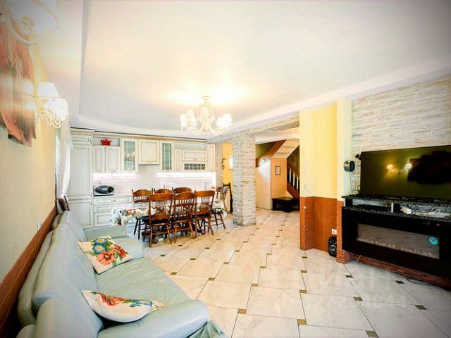 Первый этаж: гостиная 64 м кв. (большой стол, кухня, огромный бежевый кожаный диван с камином, колонки с ауксом, 46 дюймовый телевизор), ванная комната с джакузи и биде, спальня, открытая терраса.