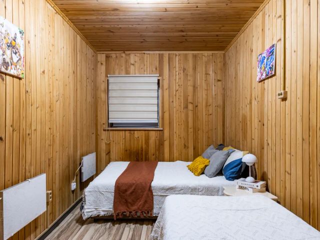 Дом с панорамным остеклением во всех комнатах, с 2мя спальнями, открытой террасой и кухней-гостиной. Площадь дома 54 кв. м.