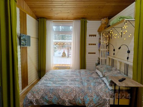 Дом рассчитан на комфортное проживание 2 человек + 2 дополнительных места, детская кроватка предоставляется бесплатно, по запросу. Спальные места: кровать в спальне и большой диван-кровать в гостиной. В доме гостиная, спальня, кухня, совмещённый санузел. В спальне кровать 140*200см, с удобным матрацем и анатомическими подушками для комфортного сна. На кухне есть всё необходимое, вплоть до губок и жидкости для мытья посуды и полотенец, небольшая посудомоечная машина. Просьба обратить внимание, вода в доме из колодца, с большим содержанием железа, особенность данной местности. Питьевую воду необходимо брать с собой, но на территории поселка есть источник с питьевой водой в пешей доступности.
