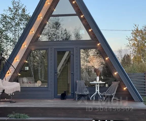 Застекленная терраса со столиком , креслом и диваном , с видом на сосновый лес и открытая терраса со столом и креслами.
