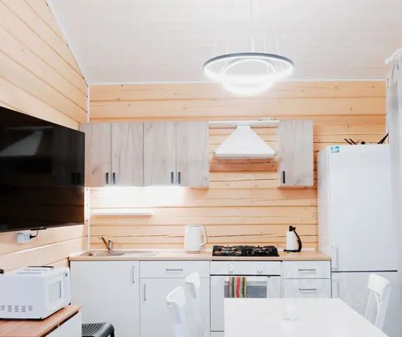 - Большая светлая кухня полностью оборудована для приготовления пищи. Газовая плита, духовая печь, холодильник, горячая вода в кране. Большой обеденный стол со скамейками для застолий.