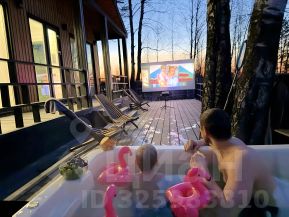 Перезагрузка в 40 мин. от СПб Кинотеатр у костра • баня • джакузи Идеально для пар, семей, девичников и встреч с друзьями. Только у нас: — Большая лаунж-зона с костром — Дом с большой террасой над склоном. Вид просто потрясающий! — Горячая купель с гидромассажем среди деревьев. — Панорамные окна с видом на лес. — Настоящая русская банька. — Безопасность и комфорт. Коттедж одноэтажный. Это важно, когда отдыхаете с детьми или пожилыми родителями. — Закрытая парковка на 4 машины для вашего спокойствия. — На территории один домик. Вся территория закрыта и только в вашем распоряжении. — Кинотаетр на улице на большом экране! Можно смотреть в костровой зоне, из купели, на террасе, у мангала. Поставим там, где хочется именно вам! Для вас: — Средства личной гигиены для вашего удобства — Всё для кулинарных экспериментов: соль, сахар, перец, масло, салфетки — Решетка, шампуры, казан и даже уголь с розжигом для уютного барбекю на свежем воздухе — В бане вас ждёт дубовый веник, сушки и ароматный чай для полного расслабления — Большая колонка для любимой музыки в доме — Подписки на Кинопоиске и Винк и Иви для уютных вечеров — Настольные игры для взрослых и детей — скучно не будет никому! Позвольте себе насладиться моментом, и: — Расслабиться в горячей купели под открытым небом. — Попариться в баньке. (Все доп. услуги оплачиваются отдельно). Правила проживания: — Заезд с 15-00, выезд до 12-00. — При заезде ОБЯЗАТЕЛЬНО вносится залог за имущество 15.000 рублей (возвращаем в течении 24 часов после выезда) — В доме курить нельзя ( в т.ч. кальяны, электронные сигареты и т.д). Можно курить в лаунж зоне, на террасе и у мангальной зоны. — Соблюдение пожарной безопасности обязательно. — В доме и на территории запрещены хлопушки, шары с конфетти и т.д. — Можно с маленькой, воспитанной собачкой (с доплатой- 2.000 рублей). С остальными животными проживание невозможно. — Стоимость аренды зависит от количества гостей. У нас вы можете снять коттедж на сутки, на выходные или на неделю — всё зависит только от ваших желаний! Скорее бронируйте свободные даты!
