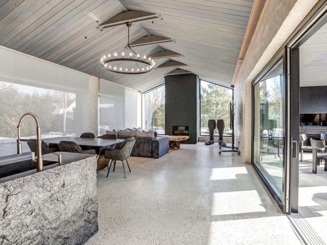 Одноэтажная архитектура, панорамное остекление, 6-метровый раздвижной стеклянный проем из гостиной на террасу, сочетание графитовых, серых и теплых минеральных тонов в отделке. Терраса остеклена по периметру, оснащена зенитными окнами и стационарным камином-барбекю.