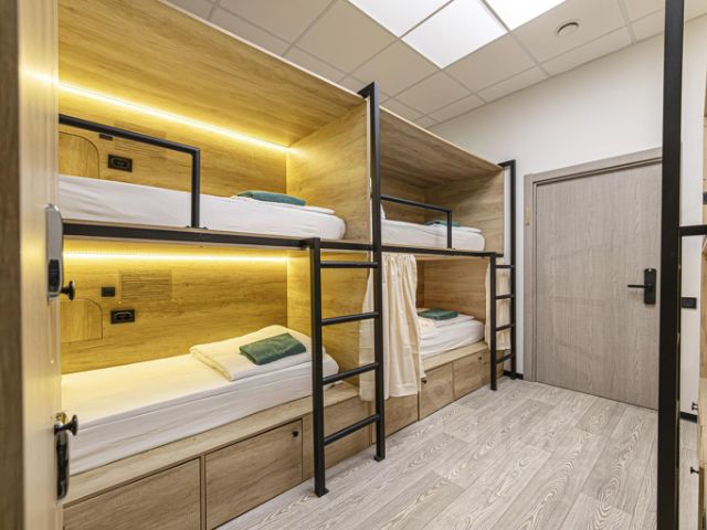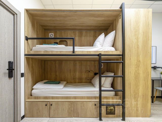 Каждое спальное место — это личное мини-пространство с ортопедическим матрасом, двумя подушками, светильником и розеткой.
