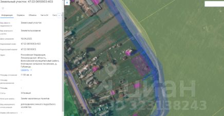 Данные получены с сайта ГИС Торги. Земельный участок с кадастровым номером 47:22:0610003:403, площадью 1135 кв.м.