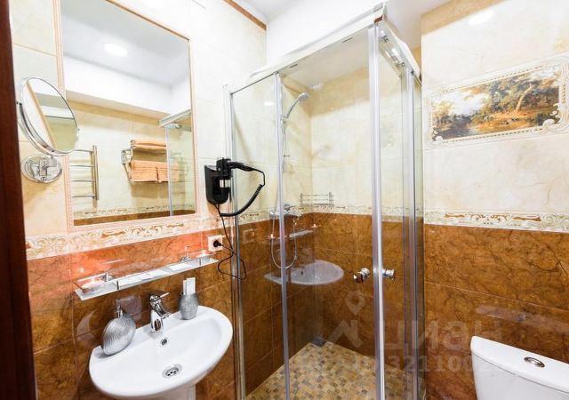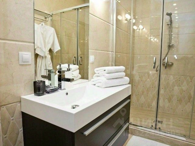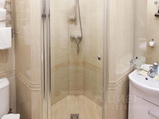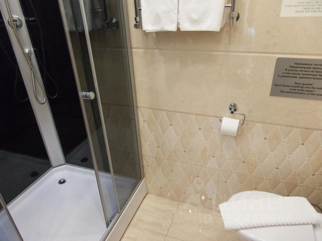 В ванной: туалет, раковина, душевая кабина, средства личной гигиены, халат, тапочки, фен, набор полотенец.