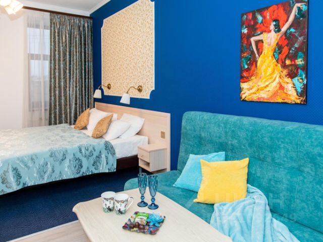 Просторный светлый номер с большим окном, имеющий зоны для сна, отдыха и рабочее место. В номере: двуспальная кровать king-size шириной 180 см, угловой диван-кровать, кресло с журнальным столиком, шкаф, рабочий стол, обеденный стол, большой ЖК телевизор, бесплатный wi-fi, сейф, холодильник, телефон, кондиционер, электрический чайник, халаты, тапочки. Санузел: ванна, унитаз, 2 раковины, фен, полотенцесушитель, полотенца, жидкое мыло, шампунь-гель для душа.