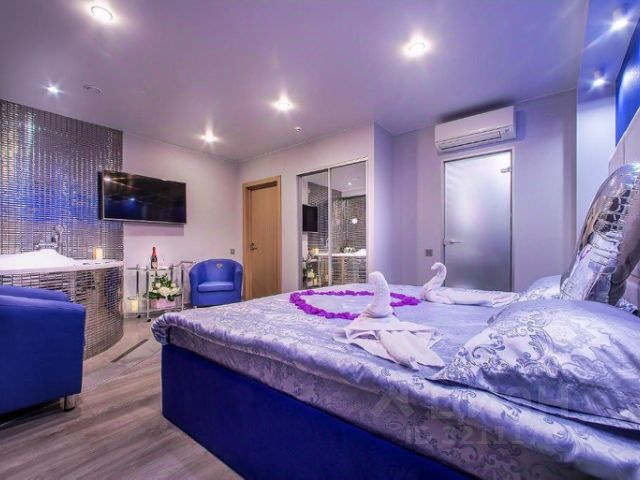В номере двухъярусная кровать - снизу двуспальная, сверху односпальная, не раскладывающийся диван, гардеробная секция, столик, стул, зеркало, ж/к телевизор. Удобства (душ, туалет) находятся на этаже.