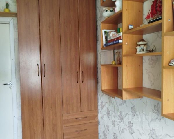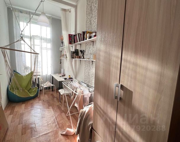 Окно выходит на парк Олимпия. Комната 2-ярусная (наверху икеевский матрас 140х200), в комнате помимо спального места есть: письменный стол, стул, 2 штанги для одежды, стеллаж, полки, настольная лампа, пробковая доска для заметок, два светильника, без пуфика.