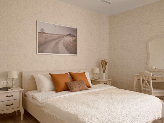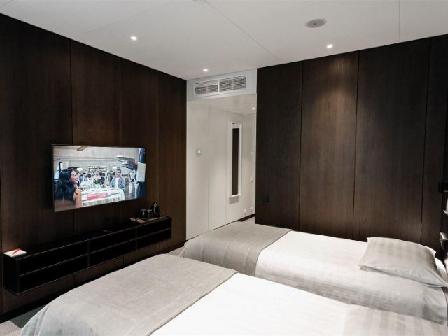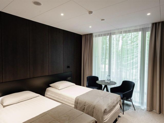 В номере две односпальные кровати, прикроватные тумбочки, обеденный стол, стулья, телевизор, холодильник, микроволновая печь, электрический чайник и комплект посуды (тарелки, чашки, стаканы, столовые приборы).