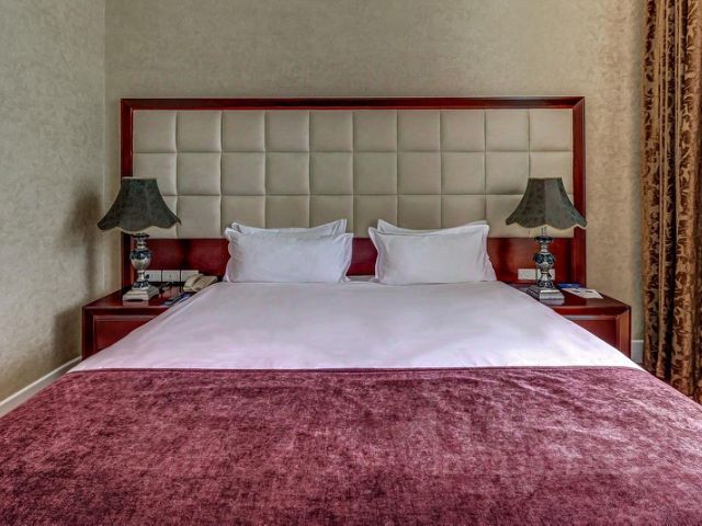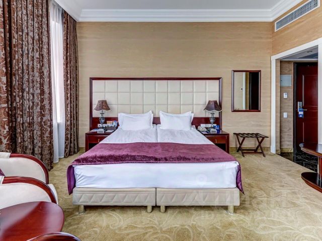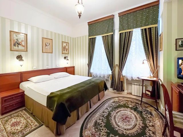 Комната включает в себя кровать 140-180 см, прикроватные тумбочки, письменный стол, стулья, платяной шкаф, 2 светильника над кроватью, торшер, ЖК телевизор + DVD, кондиционер, холодильник, тапочки, халат, полотенце банное, для лица, коврик для ног, санузел в номере. В санузле: туалет, раковина, душевая кабина, косметический набор (гель для душа, шампунь), фен. Окна выходят на тихий двор.