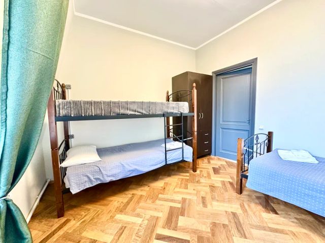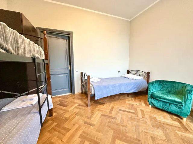 Просторный светлый номер со свежим ремонтом и новой мебелью. В номере большая двуспальная кровать, шкаф, стол, телевизор, полотенца и тапки. Туалет и душ на этаже. В туалете и душе есть диспенсеры с мылом