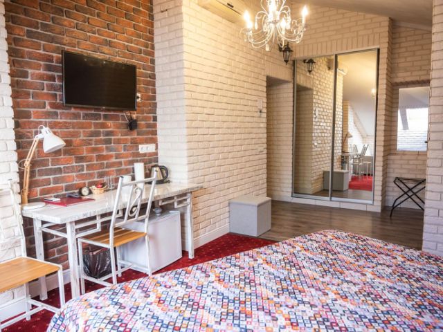 Трехзвездочный отель расположен в парковой зоне Новгородского Кремля в 100 метрах от фонтана "Садко и царевна Волхова", в 500 метрах от Кремлевского пляжа и набережной, в 400 м от площади Победы-Софийская. Расстояние до аэропорта Санкт-Петербурга составляет 186 км, а до железнодорожного вокзала 2 км. Отлично подходит как для туристов, так и для тех, кто приехал в командировку. Отель расположен в здании, построенном в 1901 году. Эта постройка является объектом культурного наследия. Для бронирования предлагаются 12 номеров различных категорий: Стандарт, Комфорт, Улучшенный и 2 номера высшей категории: Джуниор сюит. Все они оснащены комфортабельной мебелью, телевизором с плоским экраном и кабельными каналами, сейфом, электрическим чайником и собственной ванной комнатой с тапочками, феном и гигиеническим душем. В отеле работает круглосуточная стойка регистрации, гостям предоставляется Wi-Fi на всей территории и частная бесплатная парковка на период проживания. Время предоставления завтрака с 8.30 до 12.00. Номер высшей категории "Джуниор сюит" с 1 кроватью "Мансарда". Удобства в номере.