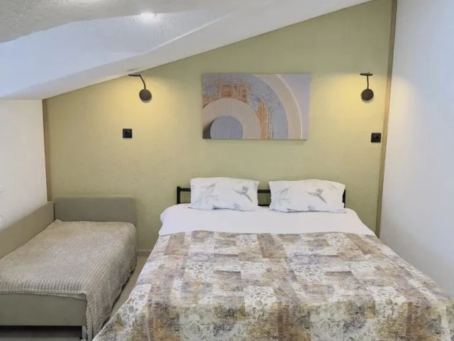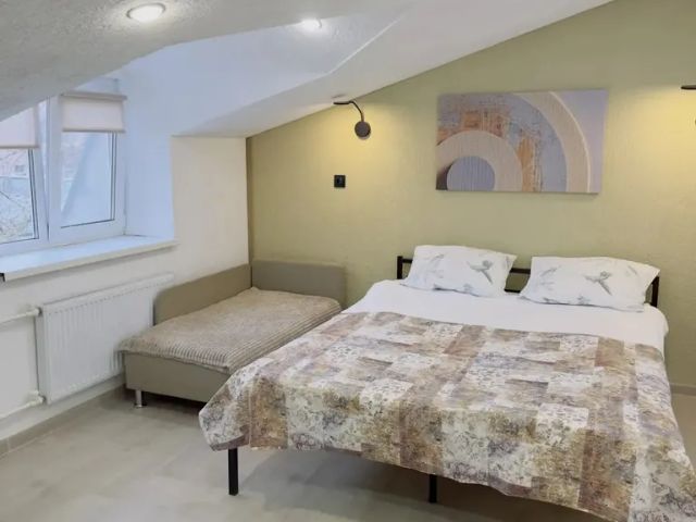 Номер оборудован одной большой двуспальной кроватью, а также дополнительно в номере имеется лофт-кровать (кровать-чердак), которая создает ощущение простора и позволяет эффективно использовать пространство, идеально подходит для детей, обеспечивая им отдельное место для сна.