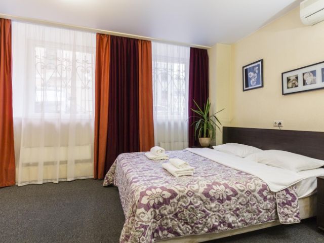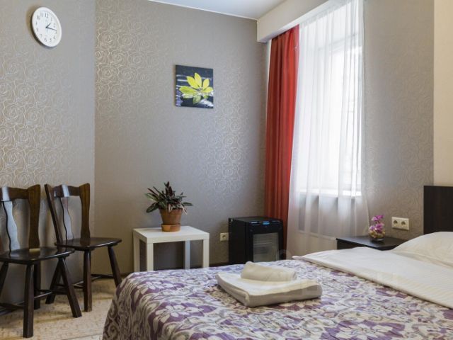 Уютный номер для размещения одного, двух, трех или четырёх человек. Площадь 22 кв.м. В номере одна большая кровать или две раздельные, мини холодильник, плазменный ТВ, светильники, плотные шторы, встроенный шкаф,телефон, столик, стул, мягкие раскладные кресла.