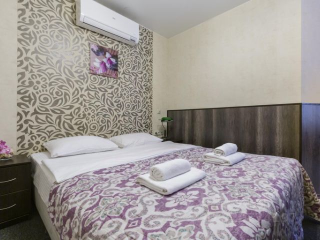 В номере гостей ждёт большая уютная кровать, своя ванная комната, вместительный шкаф, холодильник, телевизор.