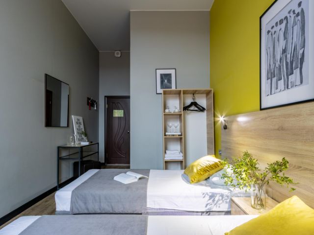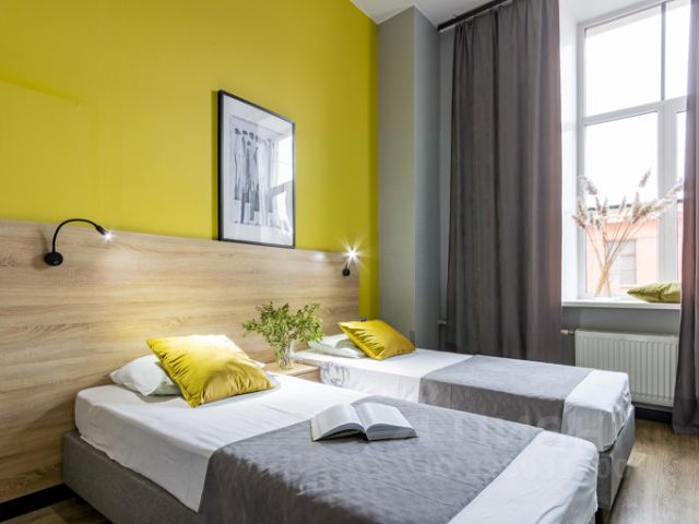 Мини-отель Иван да Марья. Предлагается стандартный номер рассчитанный на прием 2 гостей. Жилье располагается в кирпичном доме постройки начала 20 века в очень удобном месте в самом центре Санкт-Петербурга. Высокие потолки 4,2 метра позволили создать из комнаты площадью 38 кв.метра 4 небольших номера, каждый из которых рассчитан на проживание 2-х человек. 2 номера располагаются на 1 ярусе и 2 номера на втором. Из номера можно выйти в эркерную зону, откуда открываются великолепные панорамные виды на Садовую улицу в трёх направлениях - на саму Садовую и на Садовую в сторону Сенной площади и в сторону Невского проспекта.