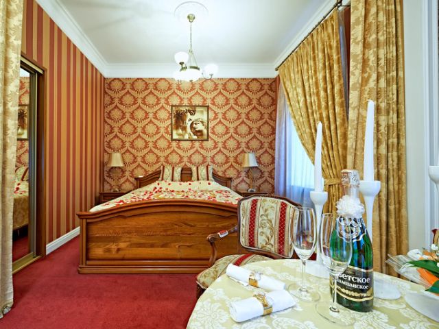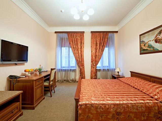 Отдельная комната с удобствами. В комнате: двуспальная кровать (или две односпальные), шкаф, письменный стол, телевизор, мини-холодильник, чайная станция, сейф. В ванной комнате: душ, раковина, туалет, фен.