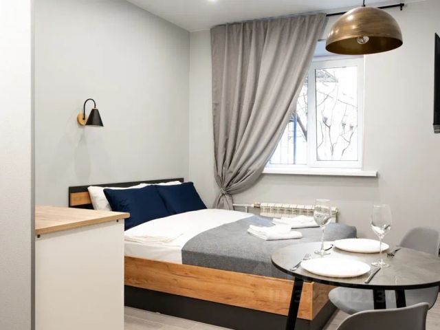 В студии свой санузел, двуспальная кровать, мини кухня со всем необходимым (чайник, посуда, столовые приборы, микроволновая печь, холодильник), ТВ, бесплатный WI-FI, встроенный фен. Стиральная, сушильная машина и утюг доступны для общего пользования.