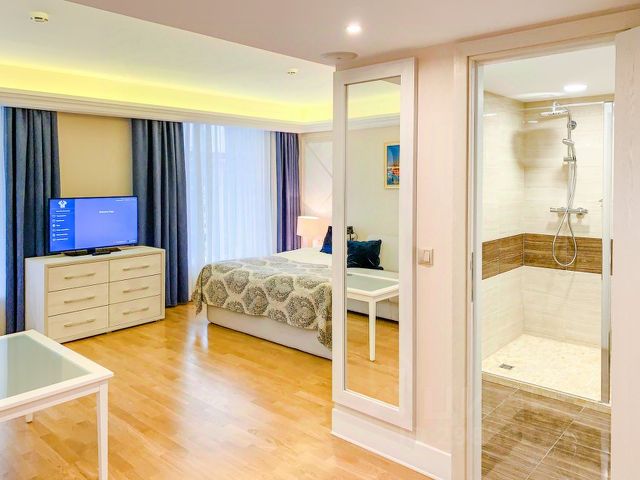 номер: WiFi, вентилятор, обогреватель, телевизор 32" smart (кабельное тв), кровать 1600*2000, раскладной диван (при использовании как спальное место - оплачивается по тарифу), небольшой холодильник (мини-бар), электрочайник, две чашки, два стакана, открывалка, сейф, стол, два стула, две табуретки, тумбочка, вместительный шкаф-гардероб, плечики, постельное белье (по количеству гостей), ваза для цветов, сушилка для обуви, ложка для обуви.