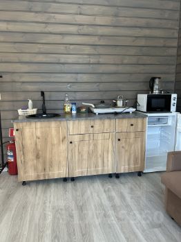небольшая отдельная, кухонный гарнитур, посуда, столовые приборы, кухонные принадлежности, разделочные доски, микроволновая печь, чайник, холодильник , газовая плита, родниковая питьевая вода, кухонные полотенца, одноразовые бумажные и тканные салфетки, средства для мытья посуды.