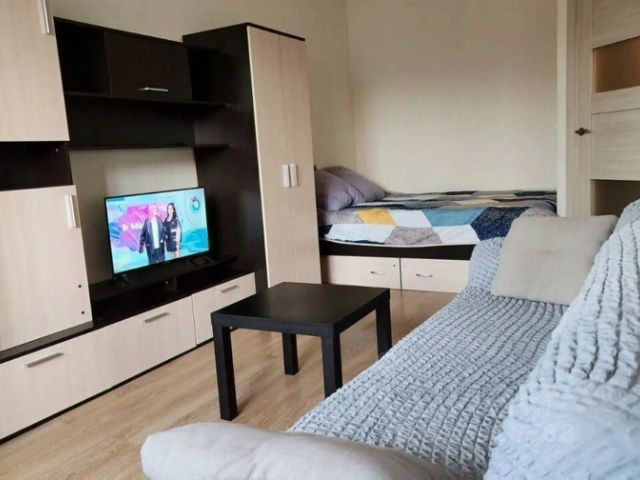 Светлая и уютная студия , есть все необходимое для комфортного проживания Квартира новая, в новом доме. Удобная двуспальная кровать и небольшой диван. Диван имеет спальное место 120*200, комфортно могут разместиться 2 ребенка или 1 взрослый.
