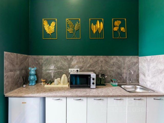 Стильная зелёная студия с дизайнерской отделкой, мягкими креслами, живыми цветами и авторским светом. Большая кухня, зонированное пространство. Всё продумано до мелочей — уют, тишина, свет и удобство. Интерьер — в насыщенных глубоких зелёных тонах, с декором и яркими арт-акцентами. В номере: просторная кровать 160 см, изготовлена вручную, с дизайнерскими элементами. Кухня со всей посудой, плитой, микроволновкой и холодильником. Велком-набор: чай и сахар. Ванна с просторным душем на монолитном поддоне (не кабинка — удобно даже крупному гостю). ТВ, Wi-Fi, плотные шторы. Высокие потолки 3,2 м — много воздуха и простора. Разные сценарии освещения: световая панель, подвесные точечные светильники над кроватью и ночная лампа создают мягкий, приглушённый свет. Фишка номера: Ванная отделена стеклянной стеной (можно закрыть шторой) — смотрится атмосферно и необычно. Тройные стеклопакеты в ванной создают полную тишину. Отличная шумоизоляция: звукоизоляционные панели на двери с двух сторон, дверь из цельного массива дерева, тяжёлая и плотная. Предоставляется комплект полотенец, шампунь, гель для душа, мыло.