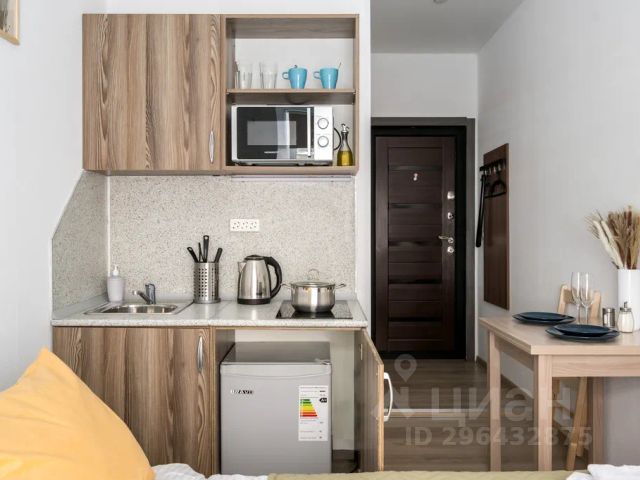 -кухня с техникой, посудой и холодильником (гостиничного образца), СВЧ печь, варочная панель