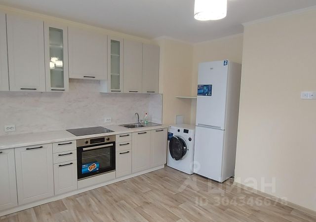 Квартира частично меблирована. Кухня оснащена встроенной кухней, холодильником, плитой с духовым шкафом, посудомоечной машиной, имеются стол, стулья, телевизор. В одной комнате есть большой плательный шкаф.