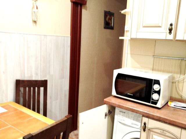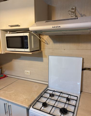 Кухня очень светлая и уютная, оборудована всем необходимым: гарнитур с множеством полочек и отсеков для хранения, способными вместить всё, что Вам необходимо для комфортного проживания. Есть вся необходимая посуда для приготовления пищи и сервировки стола (столовые приборы, тарелки, стаканы, кружки, сотейники, миски), СВЧ-печь, электрический чайник. Установлены стиральная машина, холодильник, плита с рабочей духовкой и мощной вытяжкой. Обеденная зона представлена универсальным раскладным столом с дополнительным местом для хранения.
