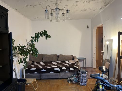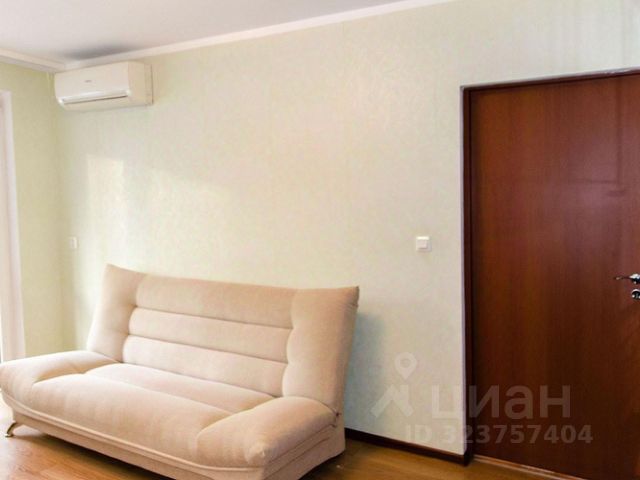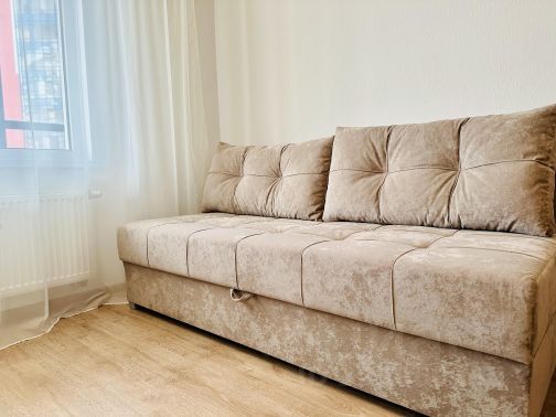В основной комнате большой раскладной диван, вместительный шкаф, длинная тумба. Есть гладильная доска, утюг, пылесос. Выведены интернет-кабель и кабель телевизионной антенны. Установлен кондиционер - лучшее спасение в летнюю жару.