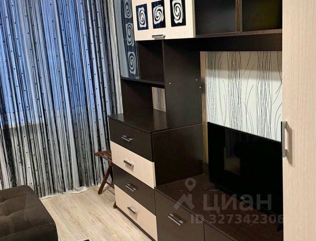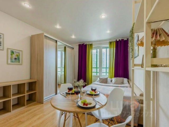 - Студия укомплектована мебелью и техникой: кухня, холодильник, плита, микроволновка, посуда, зона ТВ и телевизор, шторы, обеденная группа (стол и стулья), шкафы, полки, диван 2.30 см, придиванный столик.