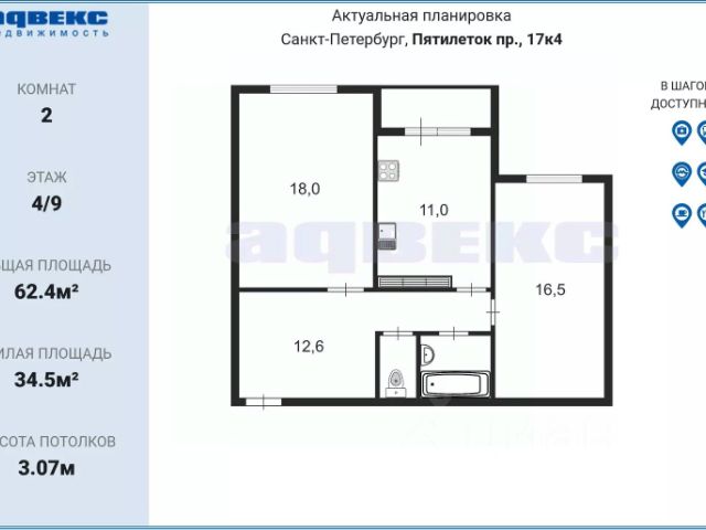 Площадь (без уч. балкона и лоджии): 33.7 м²