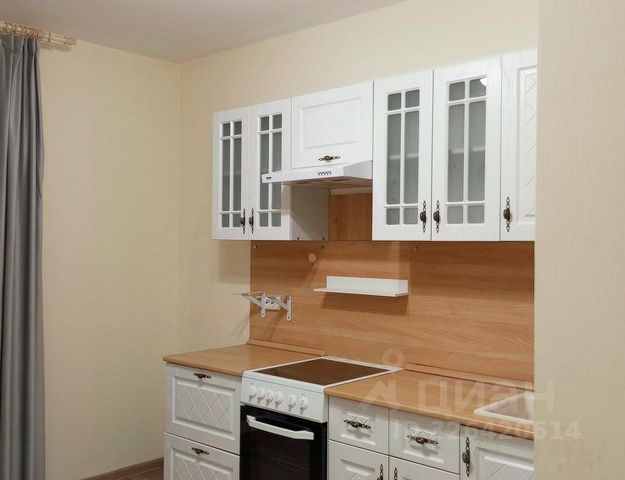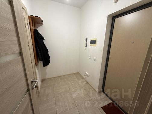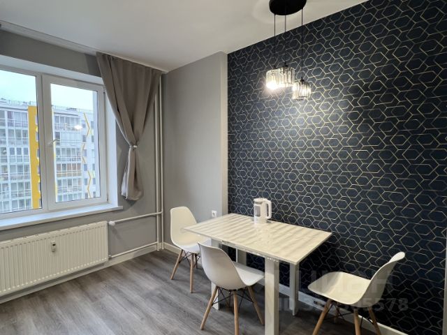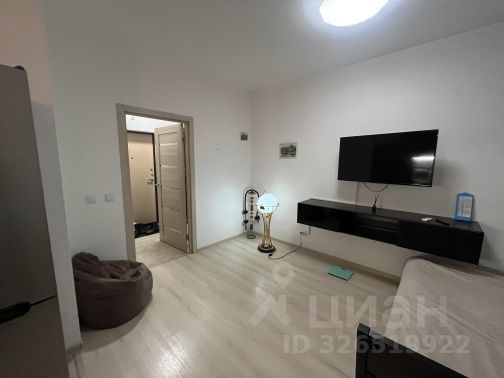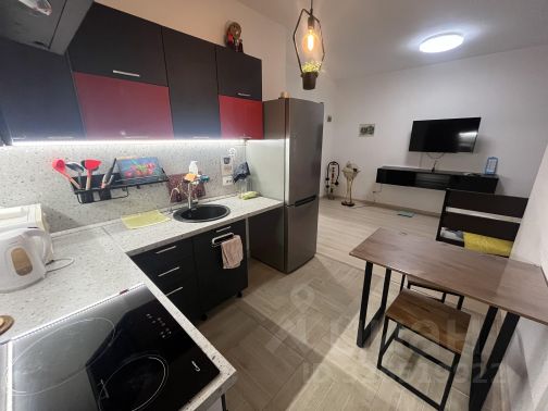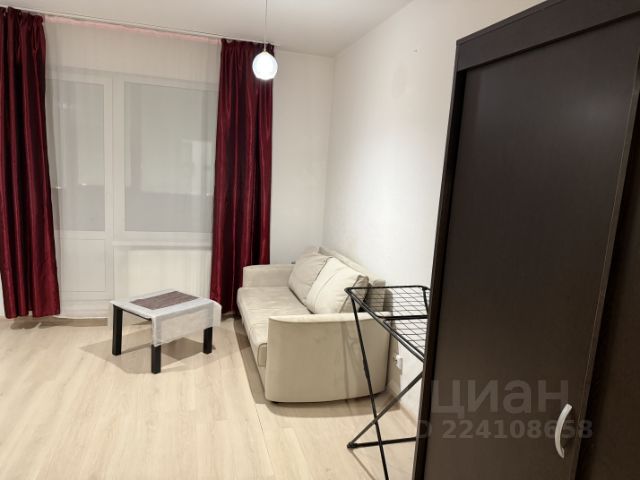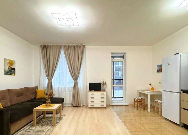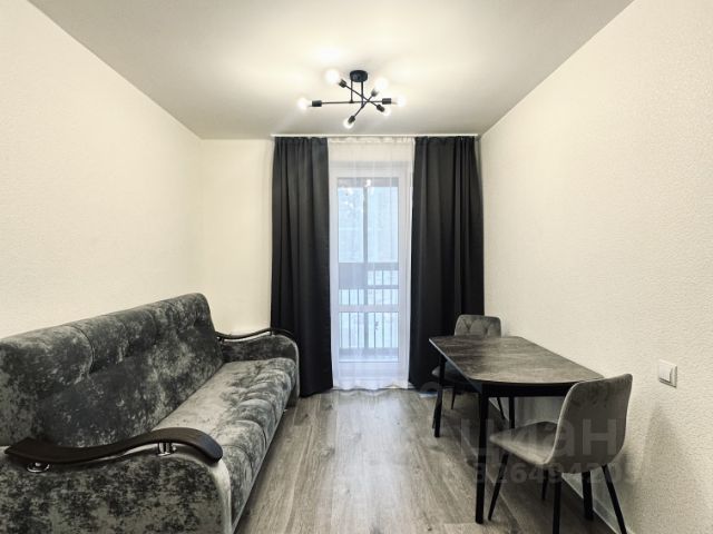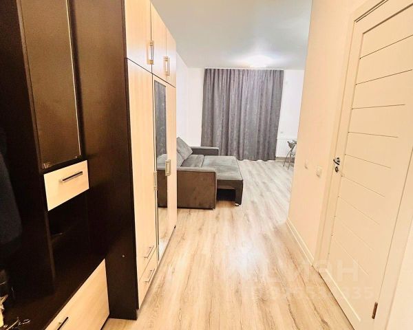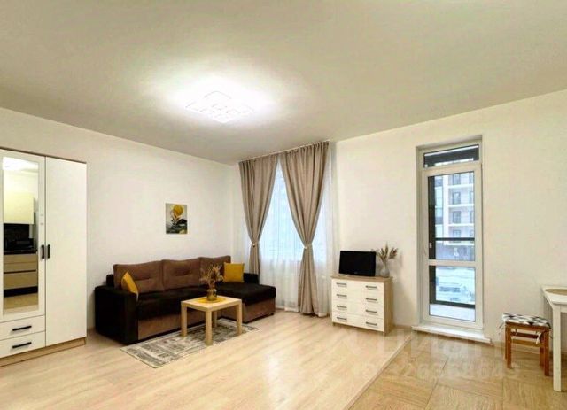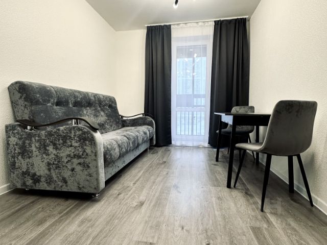 Квартира-студия с нестандартной планировкой в виде отдельной кухонной зоны и второго окна, так же основная комната отделена от коридора дверью. На окнах жалюзи и шторы.
