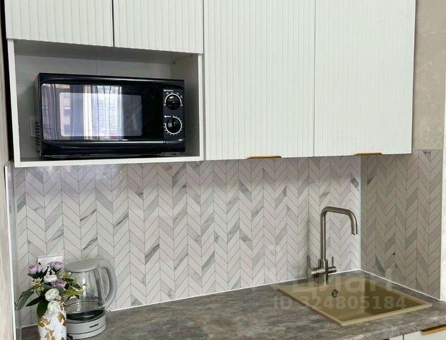 Современная мебель, встроенный кухонный гарнитур, бытовая техника, в том числе посудомоечная машина и микроволновке печь.