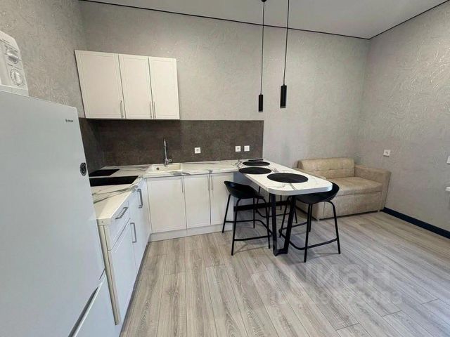 На кухне холодильник, микроволновая печь, варочная панель на газу, духовой электрический шкаф, стол в виде барной стойки и два стула.