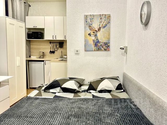 В интерьере студии имеется все необходимое для комфортного пребывания. Вы найдете здесь удобный раскладной диван, который может использоваться как спальное место, а также кухонную зону с полным набором посуды, включая кастрюли, сковородки, тарелки, кружки, вилки и ложки. На плите вы сможете приготовить свои любимые блюда, а пароварка позволит вам сохранить полезность и вкусность приготовленных продуктов.