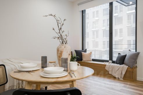 Почему эта квартира удобна для жизни: всё сделано с заботой о быте. Посудомоечная машина экономит время, стиральная машина с сушкой решает проблему с развешиванием белья, измельчитель отходов избавляет от запахов из ведра. Холодильник Liebherr с NoFrost — никаких наледей и частых разморозок. Кондиционер работает и на тепло, поэтому даже в межсезонье в квартире комфортно без дополнительных обогревателей. Шкафы-купе с зеркалами вмещают всё, что обычно занимает отдельную гардеробную.