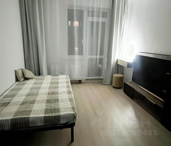 Прозрачная планировка: Спальня и просторная кухня-гостиная с выходом на застекленную лоджию.