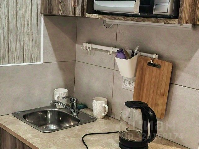 Кухня небольшая: Микроволновка, эл.чайник, посудомойка, стиралка, холодильник, кастрюльки, сковородка, посуда, сушилка, гладилка.
