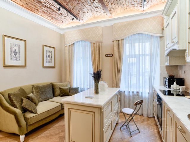 гостиная с большим столом на 6 персон, со стульями, раскладным диваном на 2-х персон, 2-мя раскладными креслами. Разложить можно, либо диван, либо кресла. Гостиная украшена декоративным камином и красивым лепным потолком;