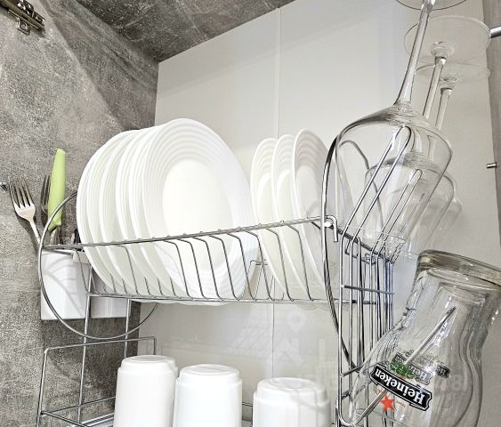 - В кухонной зоне: микроволновая печь, духовка, плита, холодильник, чайник, посуда и столовые приборы на любой случай. Чай, кофе, сахар, соль, конфеты.