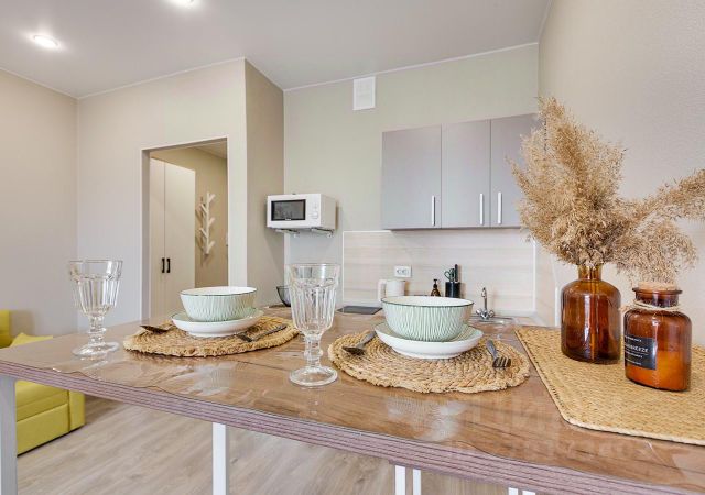 - Кухня со всем необходимым (холодильник, варочная панель, микроволновая печь, чайник, а так же посуда, приборы). Приветственный набор продуктов