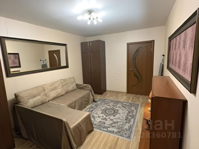 • В первой комнате находится диван, шкаф, раскладной журнальный столик, телевизор, гладильная доска, сушилка для белья, утюг, фен, вентилятор и телевизор.