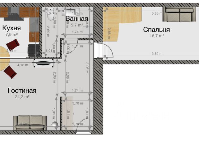 В комнате - большой телевизор. Высокий шкаф с полками и штангой для одежды вместит всё необходимое. Комфортная планировка: просторная зона прихожей, комната и кухня отделены дверями с хорошей шумоизоляцией, широкая лоджия.