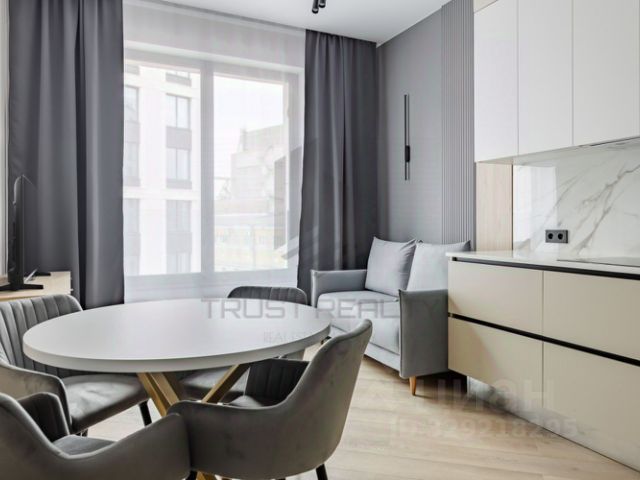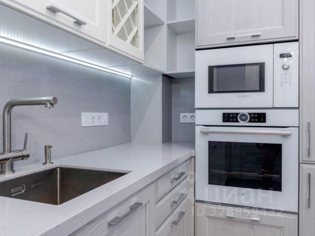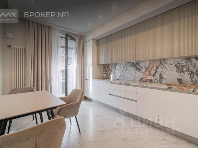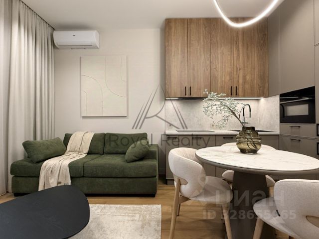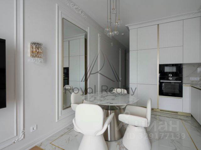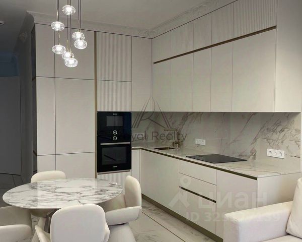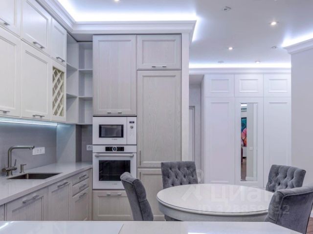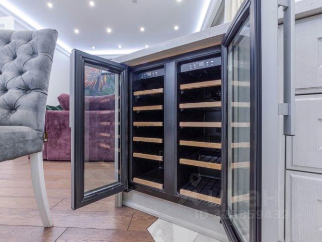 Кухня площадью оборудована современной техникой: встроенная плита, духовой шкаф, микроволновая печь, посудомоечная машина и холодильник, винный шкаф. В гостиной стильное оформление с яркими акцентами, большой диван и обеденный стол создают уютное пространство для отдыха.